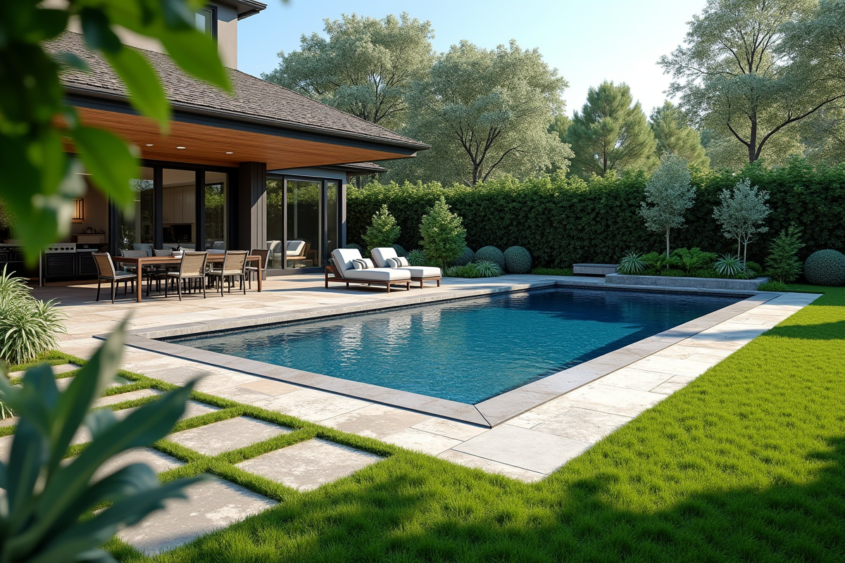 - Gestion de l’eau : intégrez des systèmes de récupération d’eau de pluie pour l’entretien de votre espace piscine.