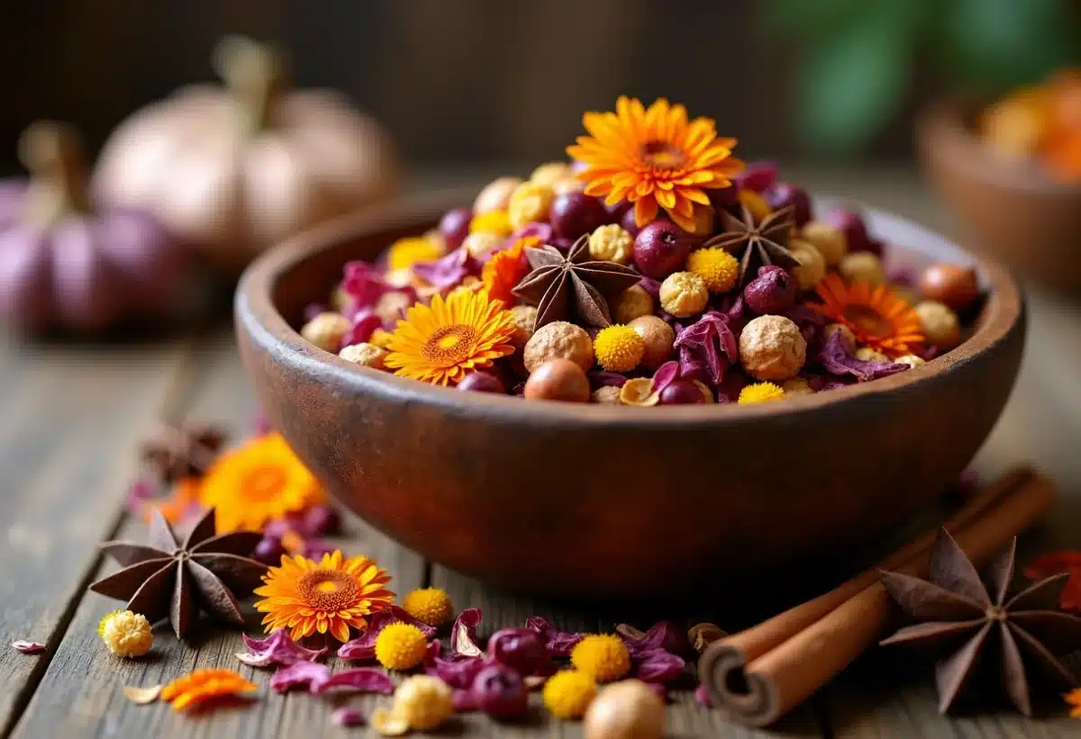 Pour enrichir votre création, pensez aux épices odorantes. La cannelle, les clous de girofle ou l’anis étoilé apportent des notes chaudes et gourmandes. Les fruits séchés, comme les tranches d’orange ou de pomme, introduisent des nuances sucrées et acidulées. Les huiles essentielles permettent de renforcer et de personnaliser l’odeur de votre mélange. Quelques gouttes de bergamote ou de bois de santal suffisent pour sublimer l’ensemble.